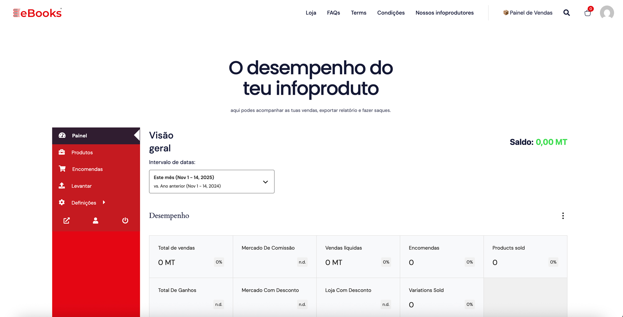 A partir deste momento, a tua conta já está ativa como infoprodutor na nossa plataforma. No painel abaixo encontrarás um relatório completo do desempenho das tuas vendas.